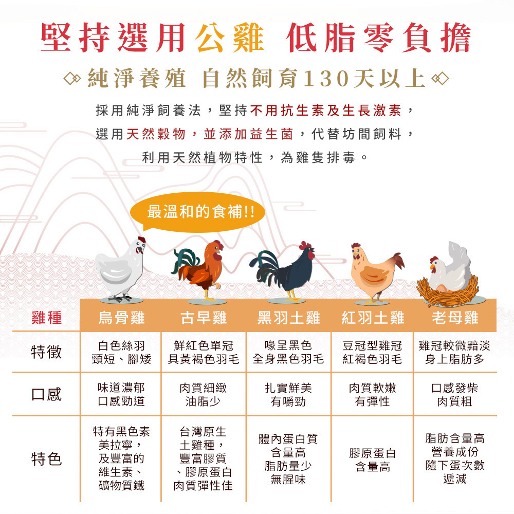 提供清楚的雞隻來源與天然的養殖環境,餵養天然的飼料,製造過程不做任何添加物。 製作出100%的純正滴雞精。