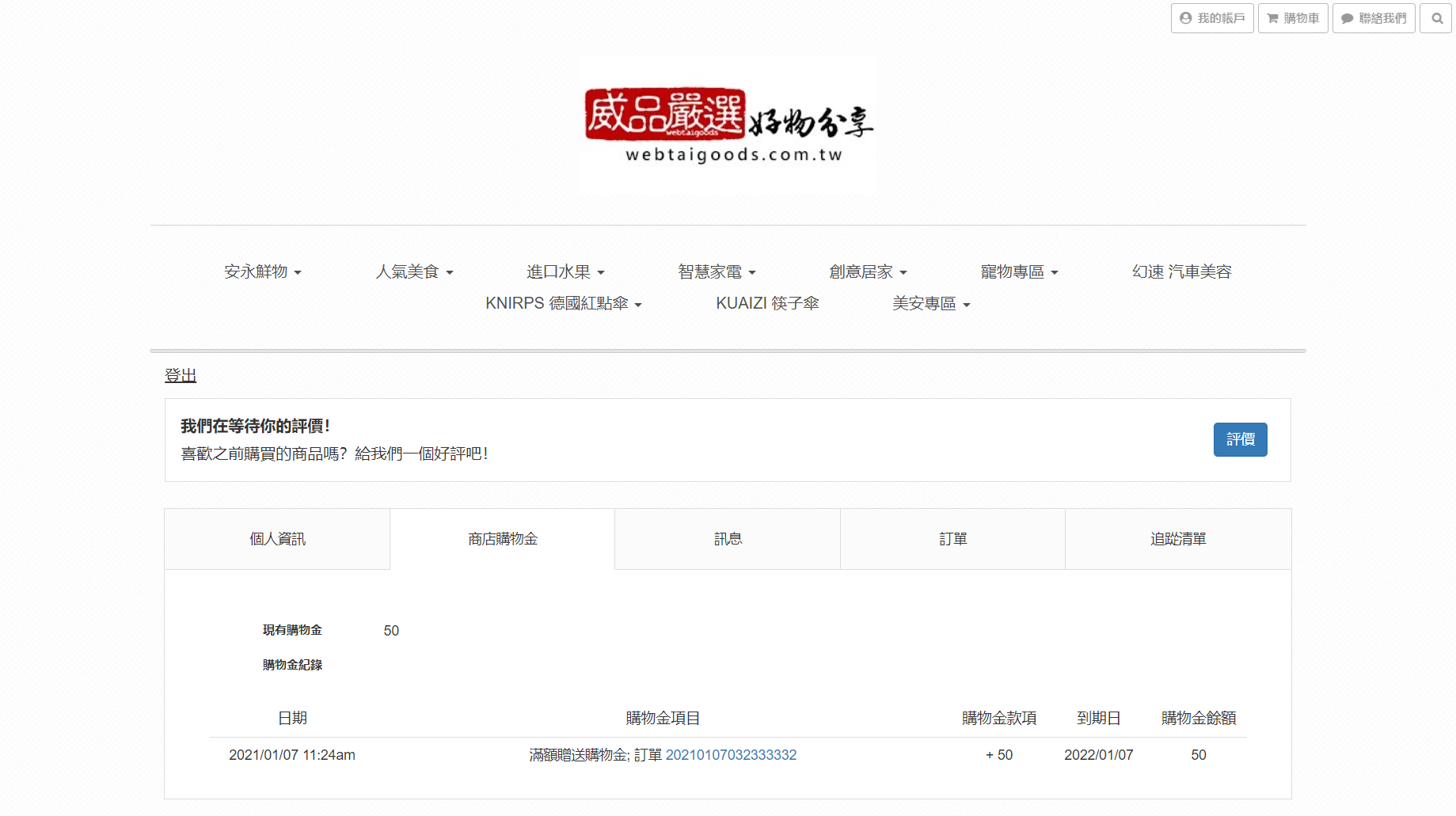 ※ 購物金查詢:至「我的帳戶」中,點選「商店購物金」分頁,即可看到購物金的使用狀況。