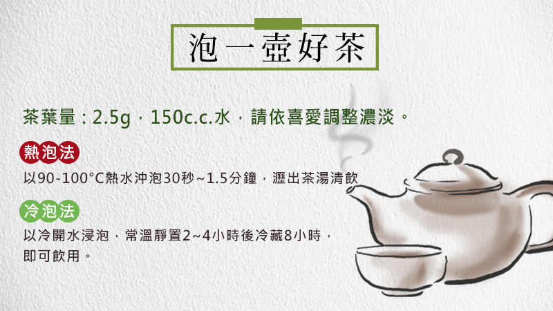 茶葉:2.5g / 水:150c.c. (請依喜愛調整濃淡)