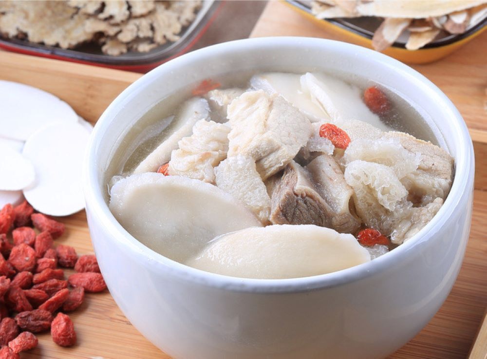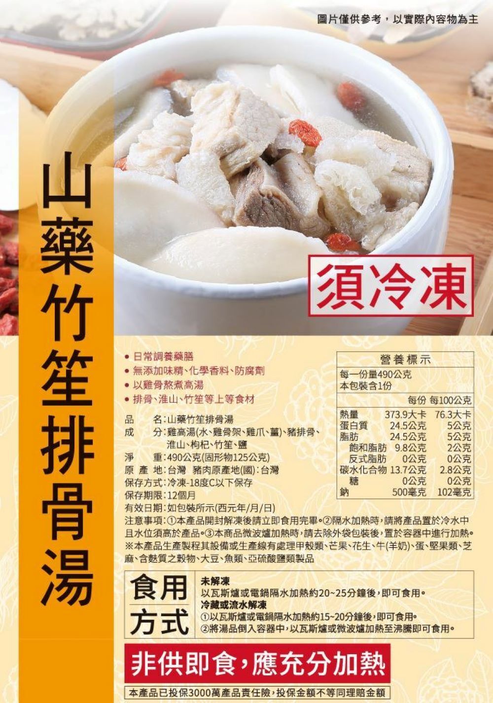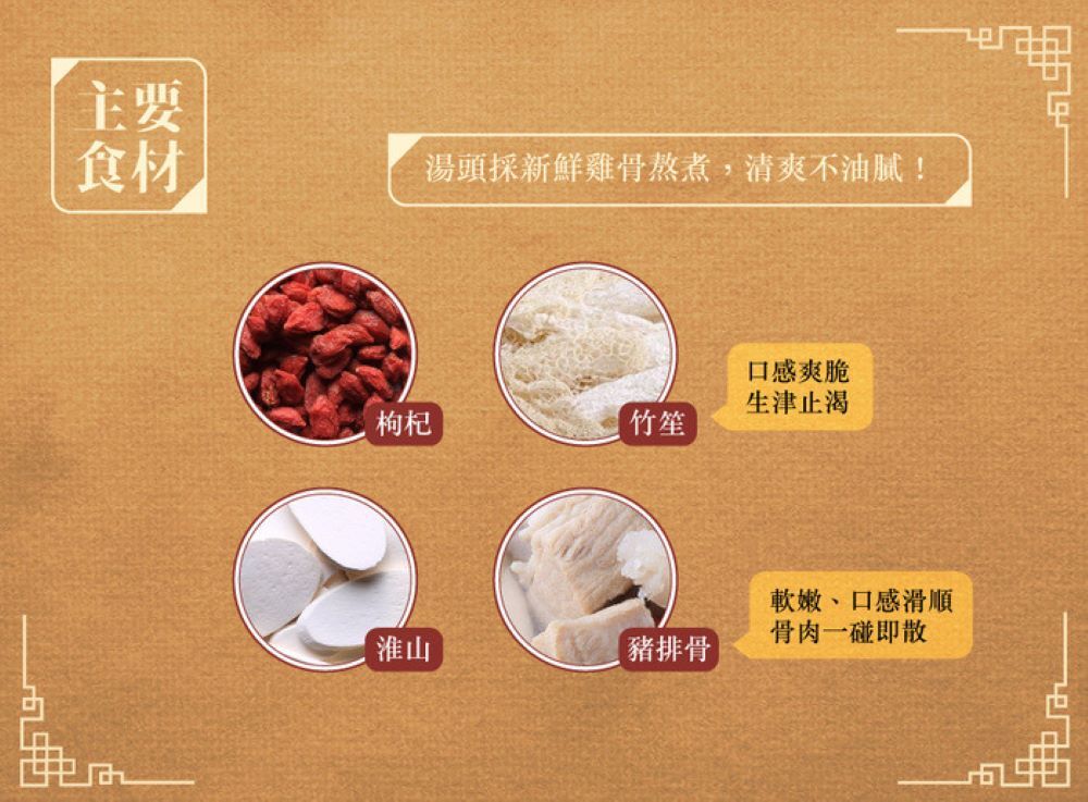 成份:雞高湯(水、雞骨架、雞爪、薑)、豬排骨、淮山、枸杞、竹笙、鹽