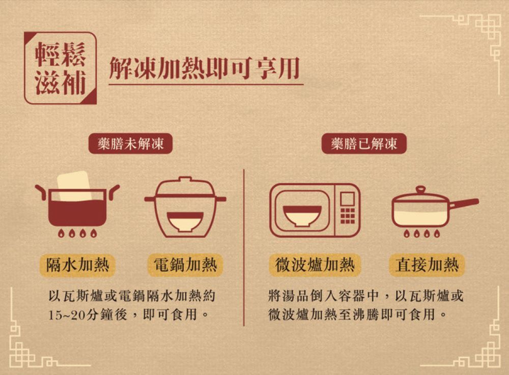 ①以瓦斯爐或電鍋隔水加熱約15-20分鐘後,即可食用