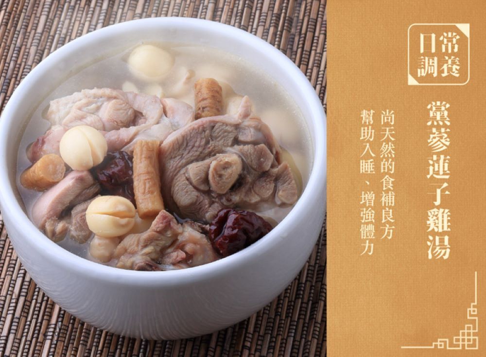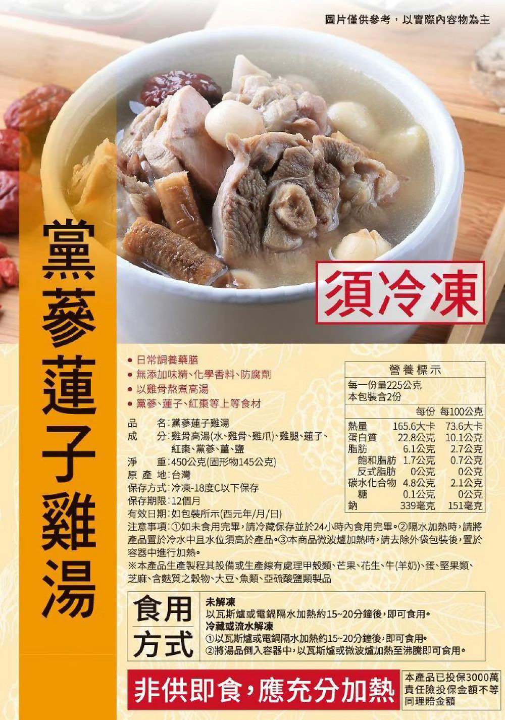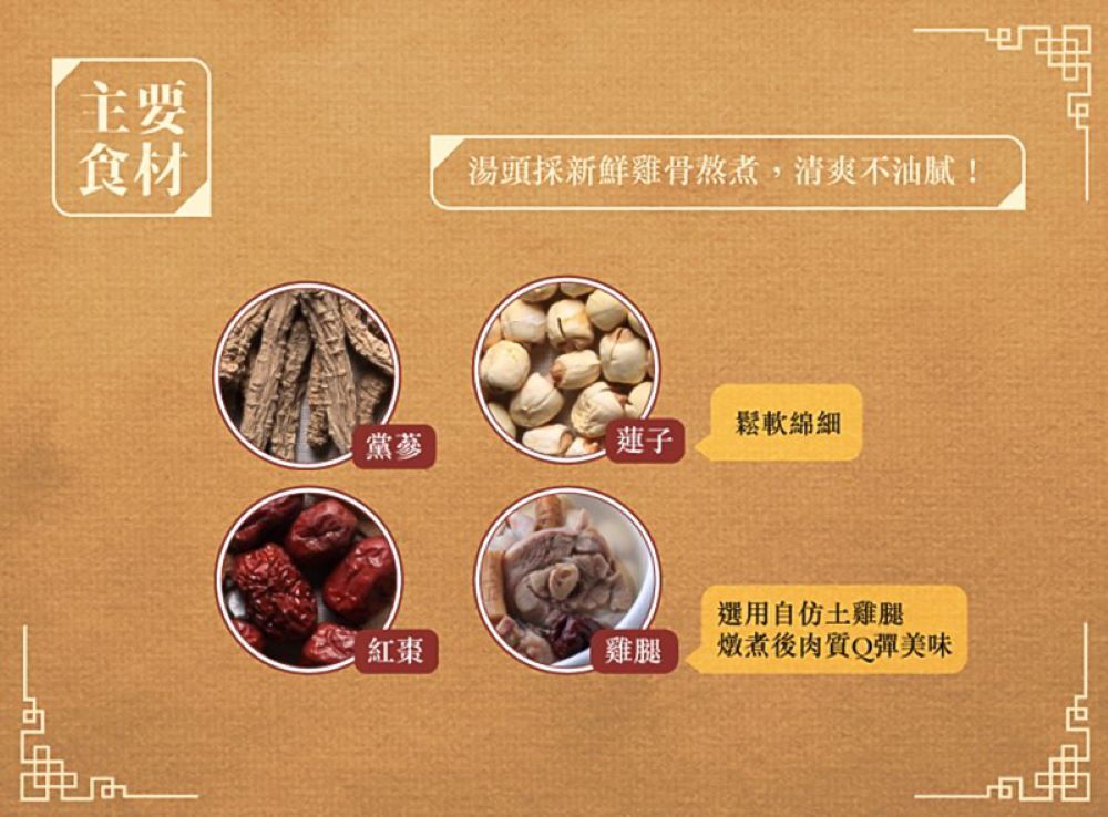 成份:雞高湯、雞腿、黨蔘、蓮子、紅棗、鹽、薑
