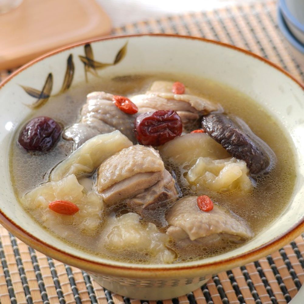成份:雞高湯(水、雞胸殼、雞爪、薑)、雞腿肉、水、花膠、米酒、花菇、紅棗、枸杞、薑、鹽