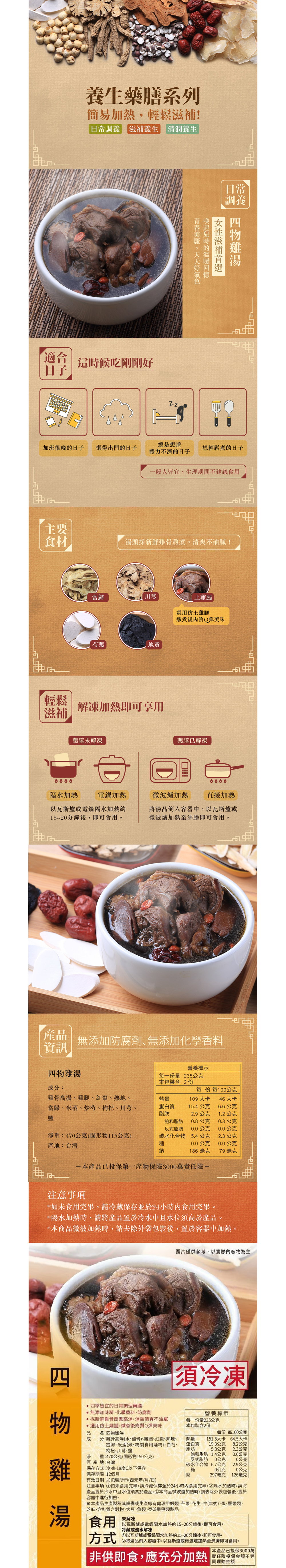 成份:雞高湯(水雞骨)、雞腿、紅棗 、 熟地、當歸、米酒 (米、精製食用酒精)、 白芍、枸杞、川芎 、 鹽