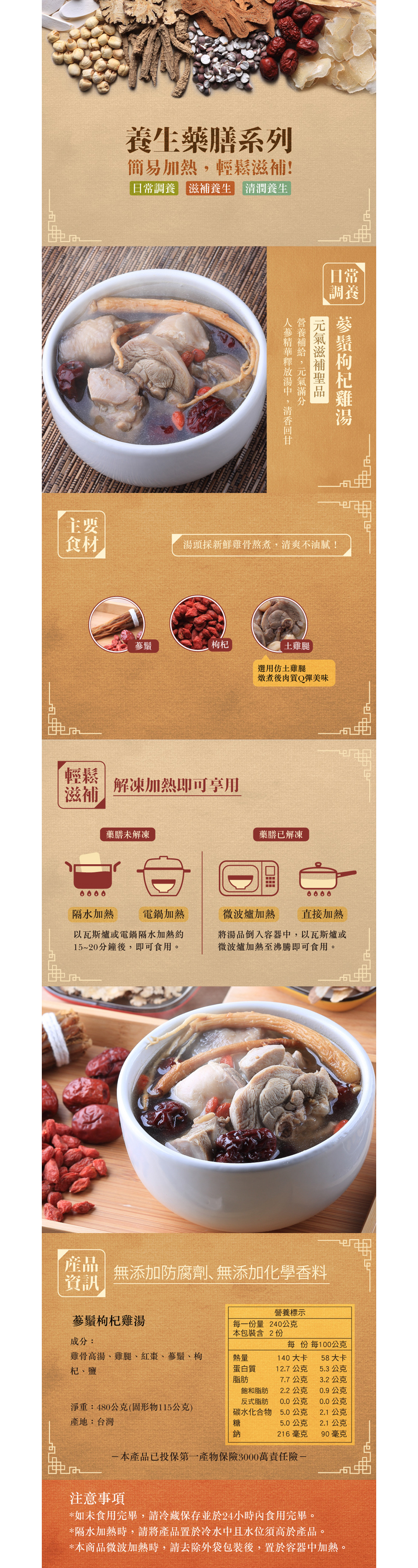 成份:雞骨高湯、雞腿、紅棗、蔘鬚、枸杞、鹽