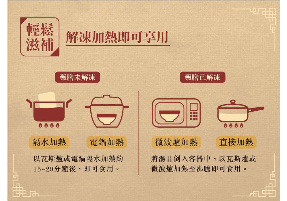 ①以瓦斯爐或電鍋隔水加熱約15-20分鐘後,即可食用