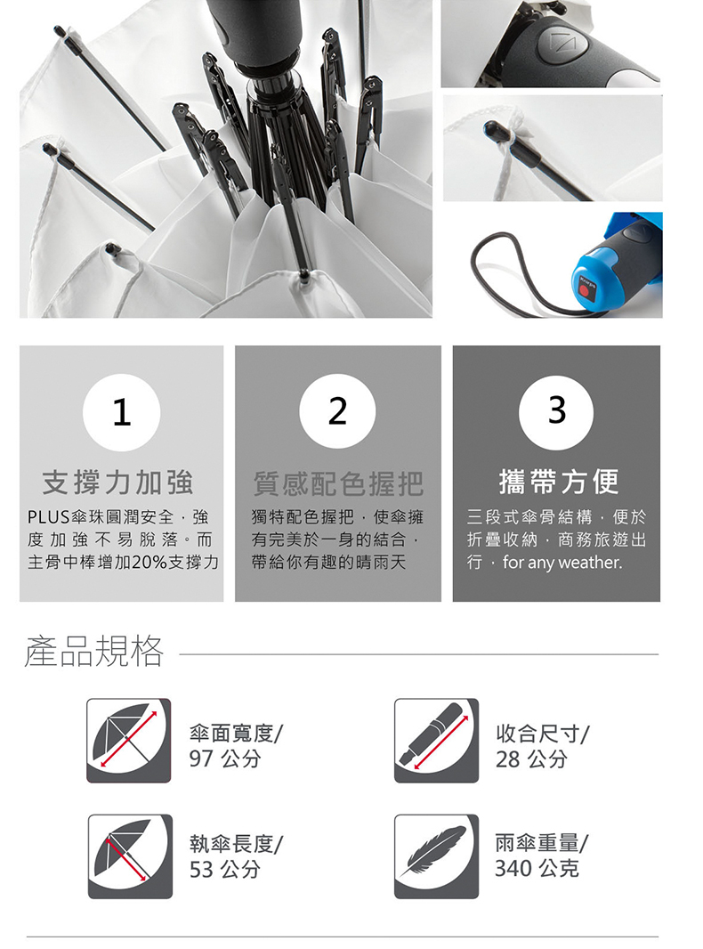 傘骨材質:高密度強化玻璃纖維、強化鋁鎂合金、防鏽電鍍金屬、ABS樹脂握把