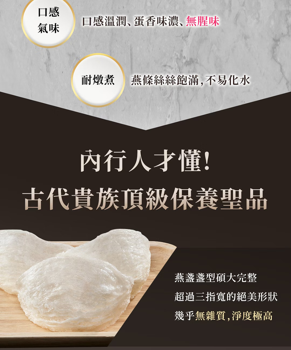 燕盞厚實,絲絲飽滿,耐燉煮,不易化水,職人半乾挑工藝燕窩酸濃度最高,每批SGS的檢驗讓您最安心~不但送禮大方尊貴自用也適宜,是最受歡迎的熱銷商品!