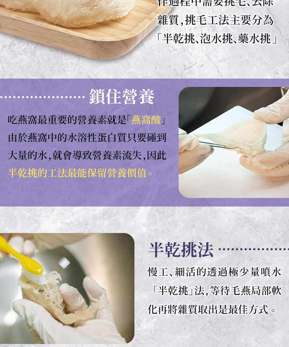 A:慕蓉燕自有燕屋的燕窩採用費時又費工的半乾挑工藝只為了保持高燕窩酸,意思是指: 我們的毛燕從採集下來之後從未被泡水發開挑毛,而是將燕窩噴水後慢慢軟化再進行純手工的三道挑毛工序,讓燕窩保持最接近原生態的質地,也保留最多的有效成分—燕窩酸,所以請您一定要經過4-6個小時浸泡冷水讓燕窩舒展開來再行燉煮,耐泡、耐燉煮、不易化水、發頭勝過其他品牌的優點也是這個原因喔!