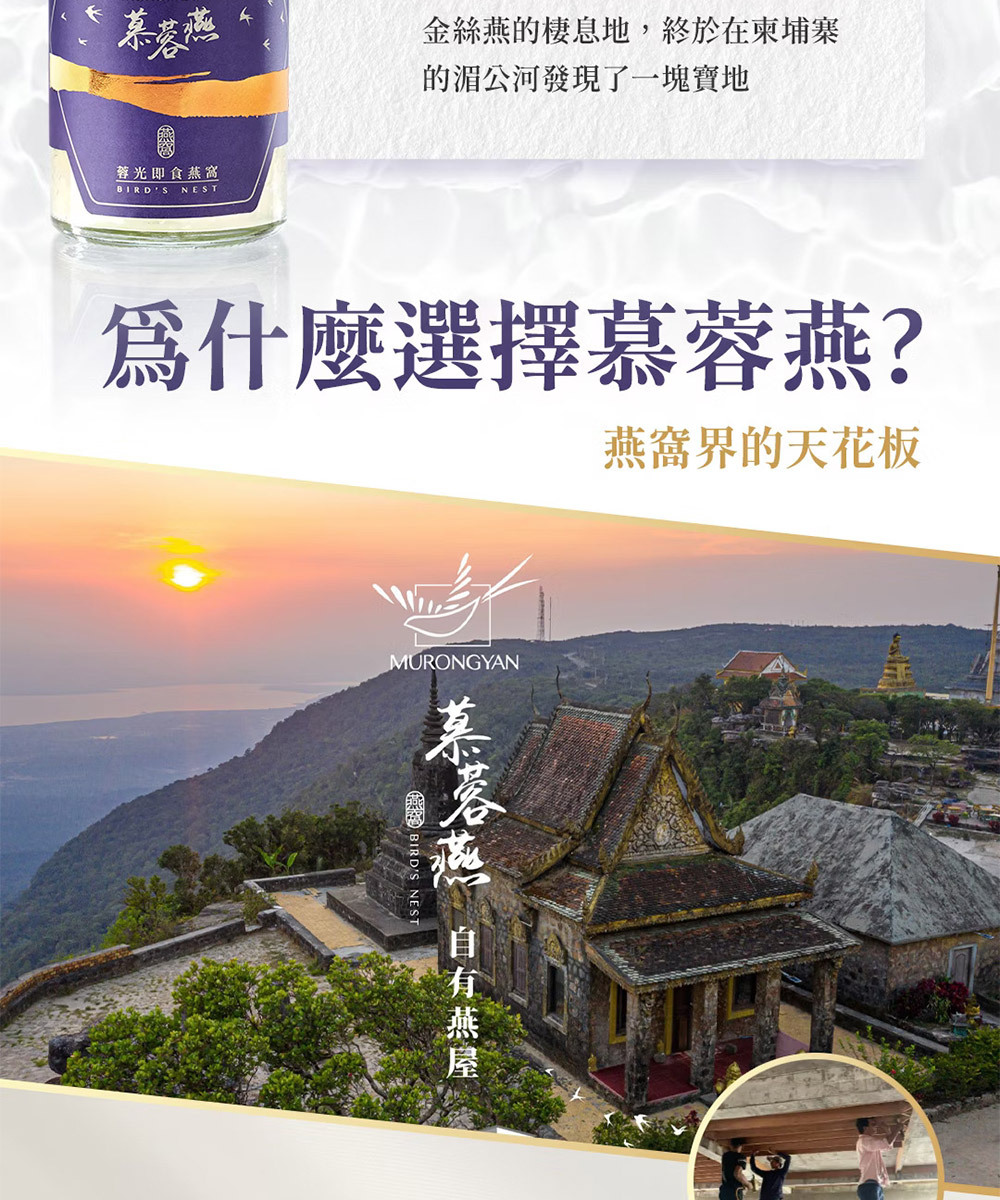 A : 慕蓉燕的燕窩皆來自公司在越南和柬埔寨的自有燕屋,給金絲燕最好的原生態環境和乾淨有管理的燕屋棲息築巢,燕窩品質自然好。