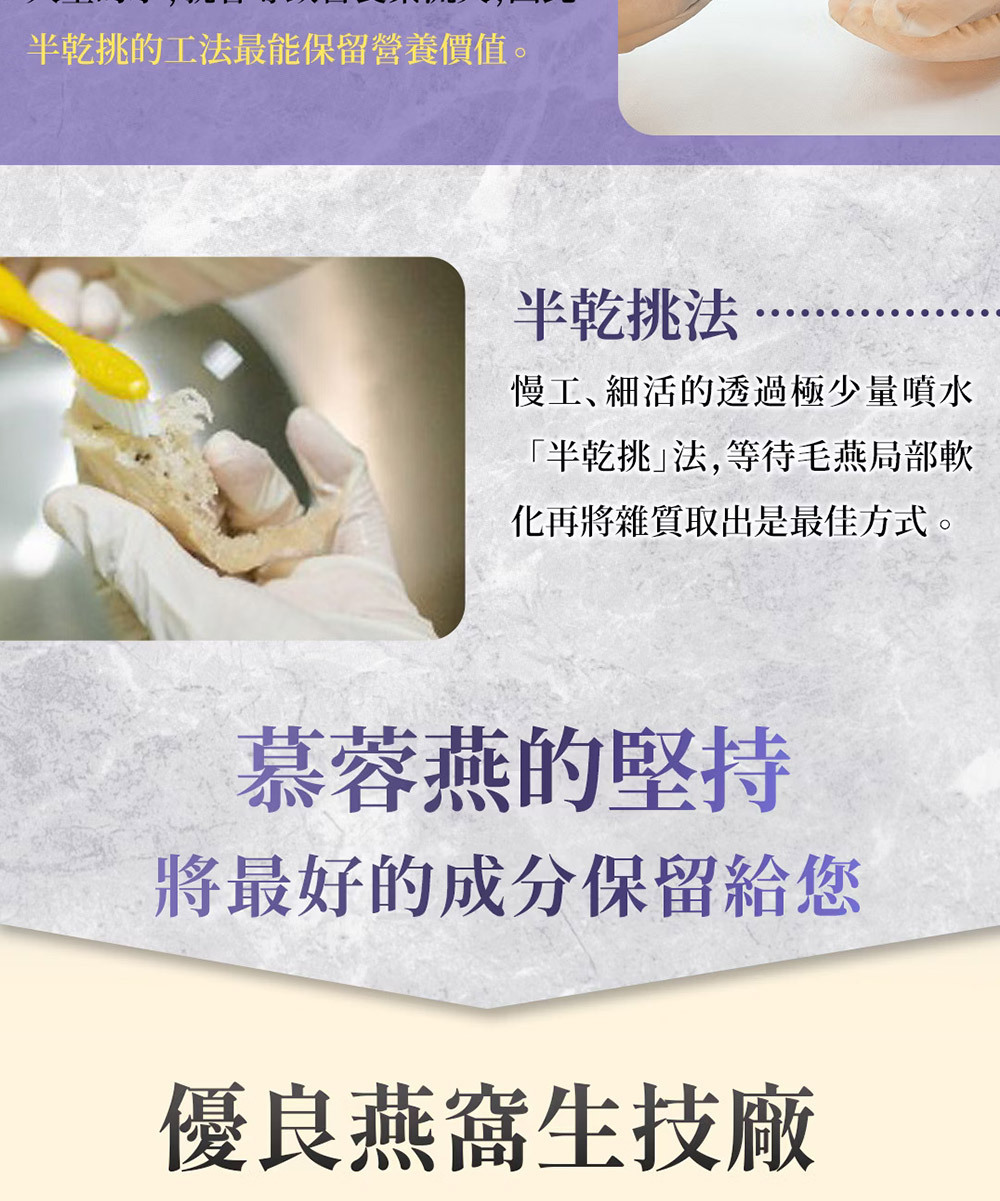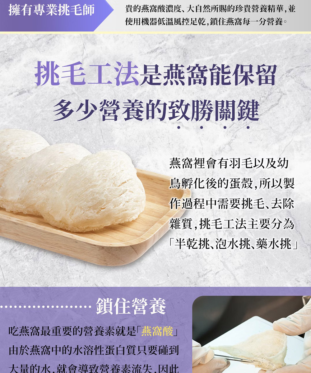 先不說有商人為了減少燕窩挑毛成本採取泡藥水的方式讓燕窩成本低、賣相好,大部分的人更是不了解為什麼吃燕窩?真正要攝取的成分是甚麼?