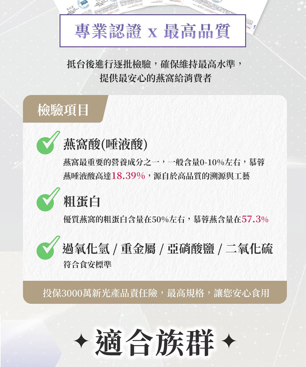 慕蓉燕不僅堅持為您保留最高有效成分—燕窩酸,更相信用科學檢驗的實證遠勝於口沫橫飛的銷售話術,我們不惜重金將每批燕窩都送SGS檢驗,批批都能提出檢驗報告,只想讓您安心放心,享用真正優質的燕窩產品。
