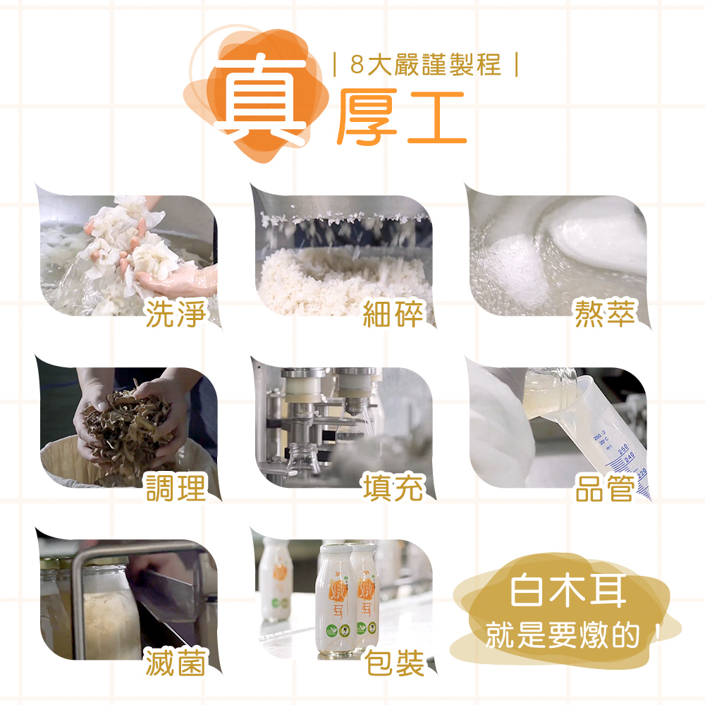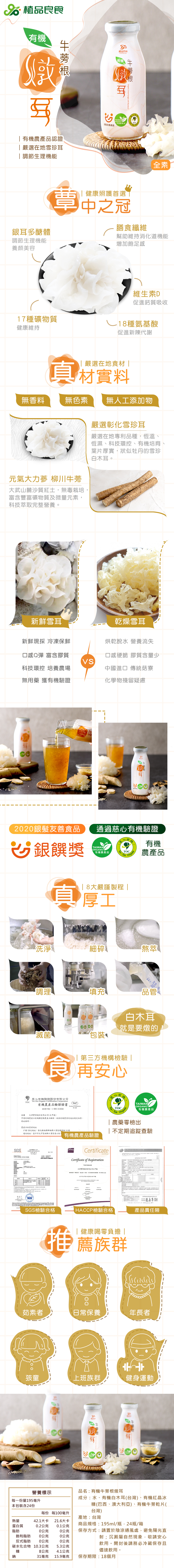 水、有機白木耳(台灣)、有機紅晶冰糖(巴西、澳大利亞)、有機牛蒡乾片(台灣)