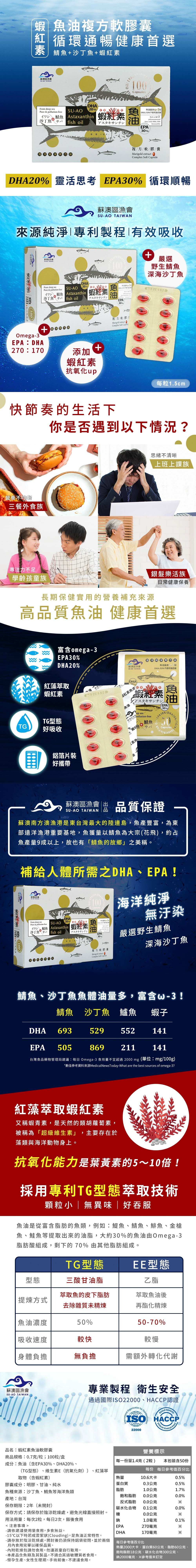成分:魚油〔含EPA30%、DHA20%、(TG型態)、維生素E(抗氧化劑)〕、紅藻萃取物(含蝦紅素)