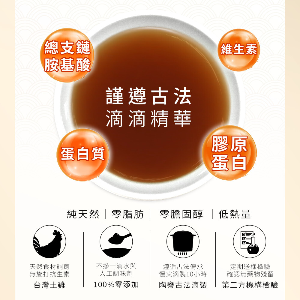 ● 古法陶甕滴製,慢火滴製10小時,不加一滴水蒸氣不回流,淬鍊出滴雞精的精華,原汁原味