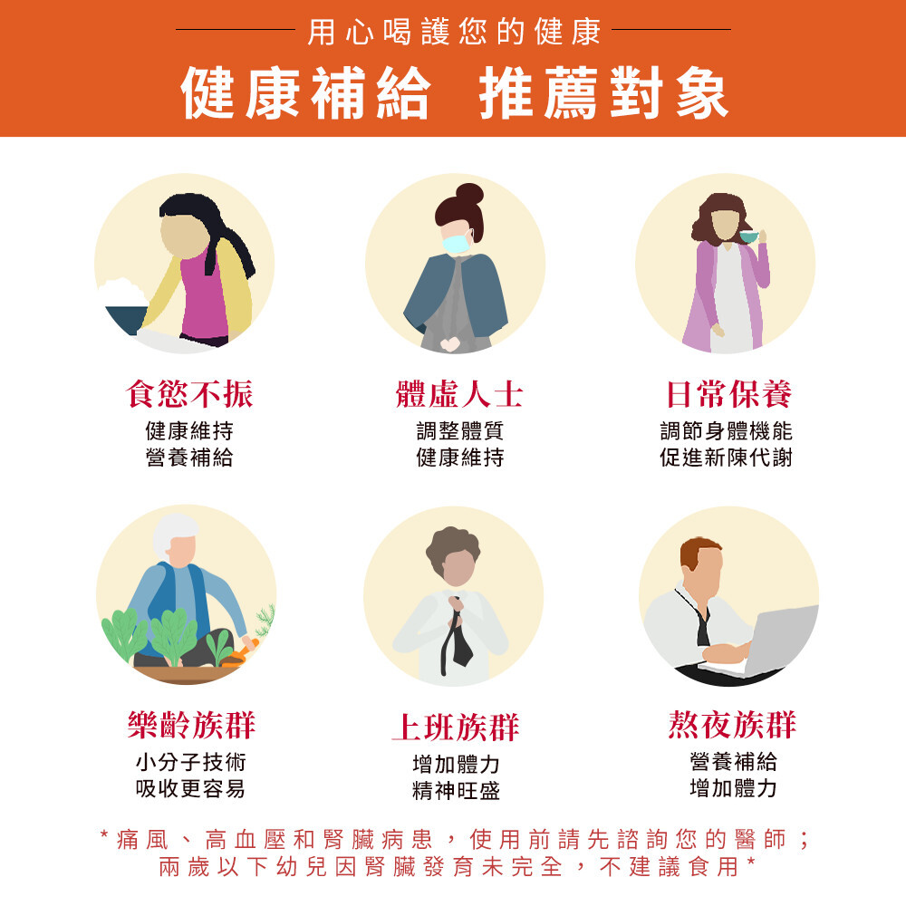 -痛風、高血壓和腎臟病患及其他患者,食用前建議請先諮詢您的醫師。