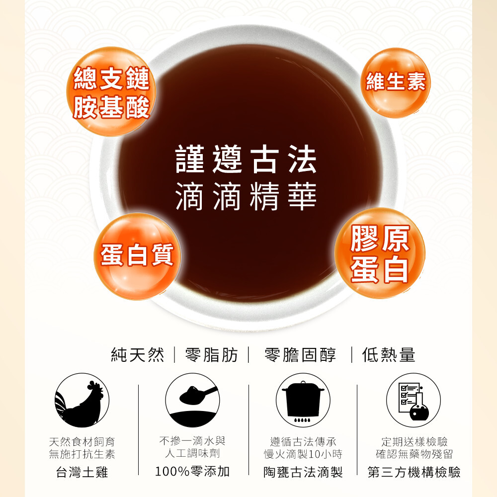 ● 古法陶甕滴製,慢火滴製10小時,不加一滴水蒸氣不回流,淬鍊出滴雞精的精華,原汁原味