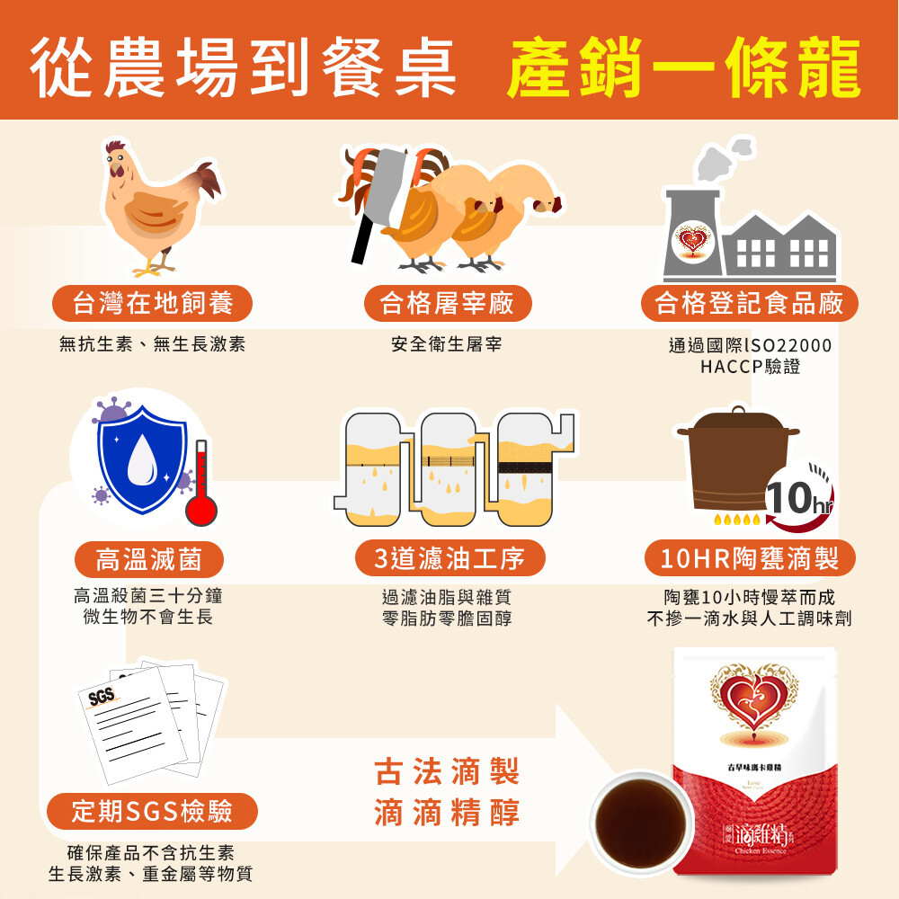 (12週齡以上的壯年雞隻),從源頭到滴精生產至包裝製程都有完整的生產紀錄,讓消費者實在安心