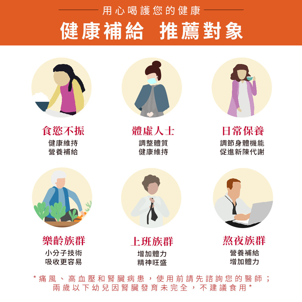 -痛風、高血壓和腎臟病患及其他患者,食用前建議請先諮詢您的醫師。